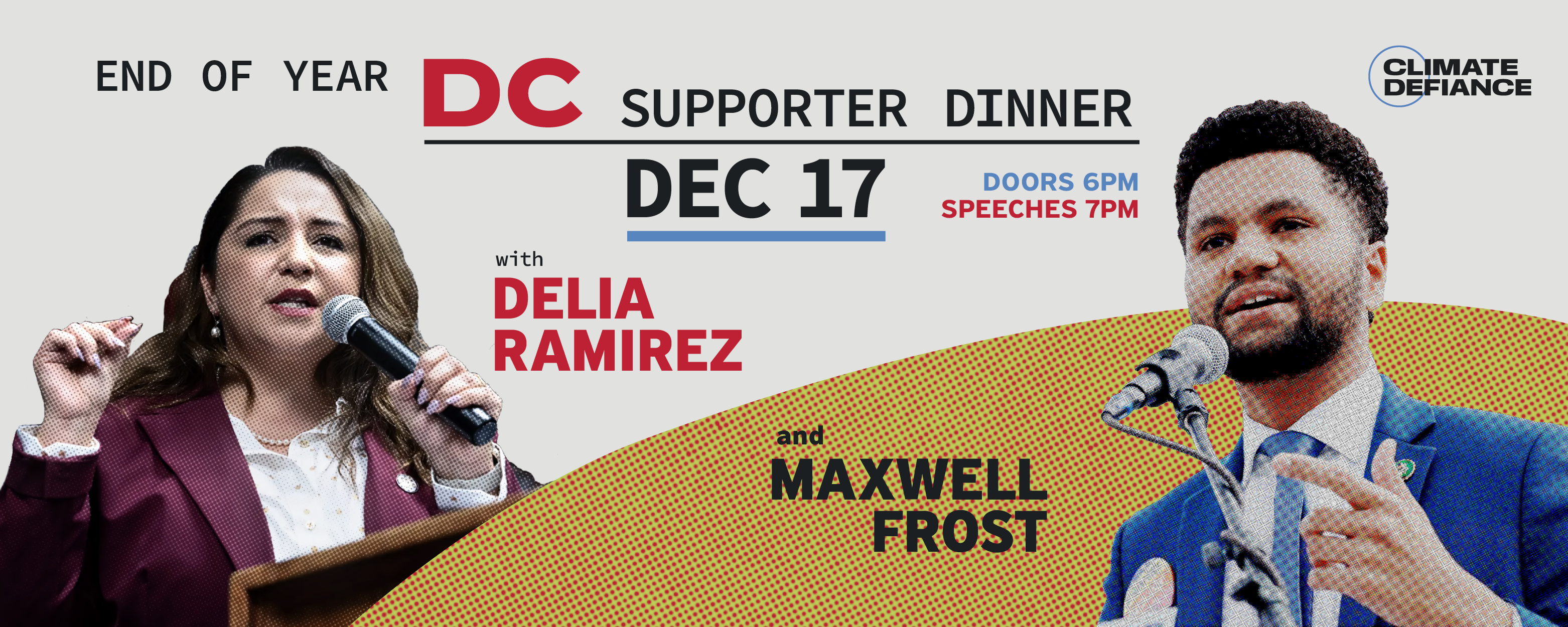 Join Climate Defiance for a special evening with Reps Delia Ramirez and Maxwell Frost in DC on December 17th!